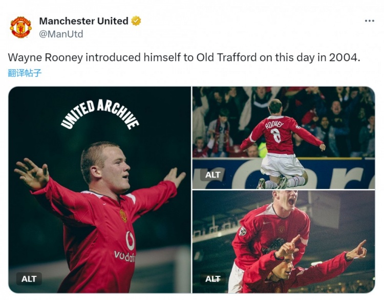 曼联官方社媒晒出鲁尼首秀的相片,总结那令东谈主牢记的一天。