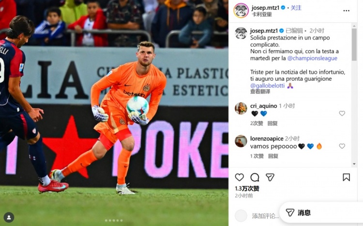 9月28日讯 本轮意甲比赛,国米在客场以2-0的比分降服卡利亚里。本场比赛,蓝黑军团门将何塞普-马丁内斯首发登场。