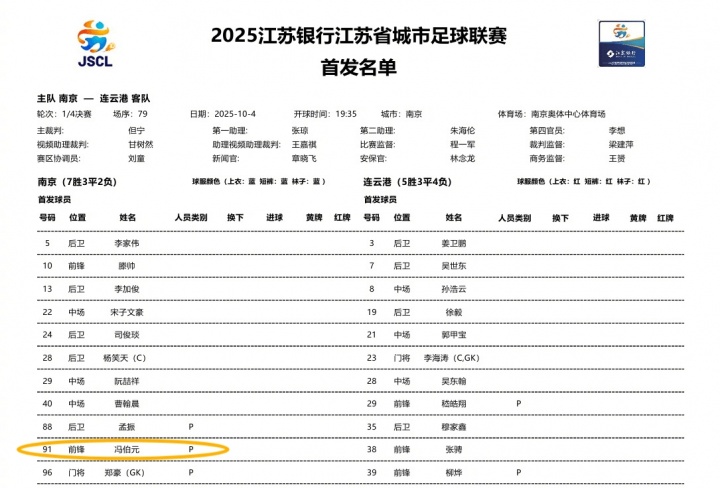 10月04日讯 “苏超”首场1/4淘汰赛,南京队对阵连云港队的首发照旧公布,其中南京队派出了现着力于青岛海牛队的冯伯元首发出场。