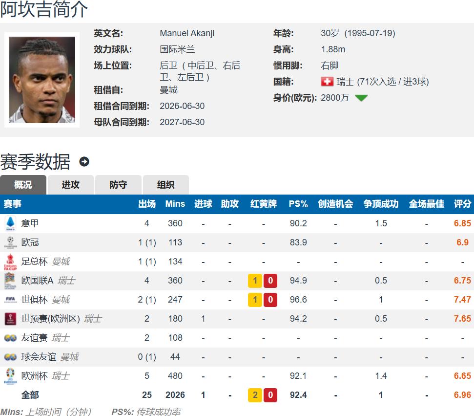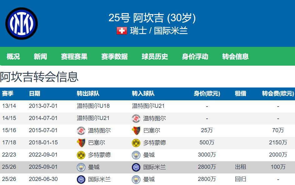 现年30岁的阿坎吉,身高1.88米,右脚球员,能踢中卫和边后卫,德回身价2800万欧元,国米1500万欧元买断还口舌常合算的。阿坎吉租赁加友邦米之后,4场意甲一皆首发,欧冠出场2次,其中1次首发。阿坎吉用6场比赛就投降了国米高层和球迷,如今蓝黑军团也曾决定买断。曼城不要,国米当宝,树挪死东谈主挪活,祝颂阿坎吉在海外米兰取得腾达。