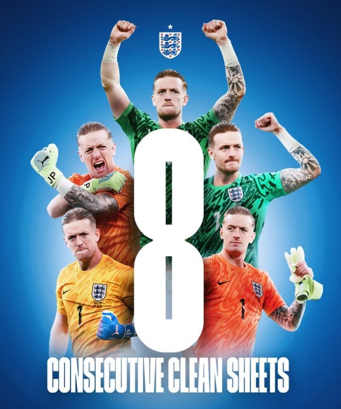 皮克福德担任英格兰首发门将,匡助球队完成零封,他相接8场出战90分钟的国度队比赛齐完成零封,英格兰男足门将历史首东谈主。当天英格兰官方发布海报道贺皮克福德。