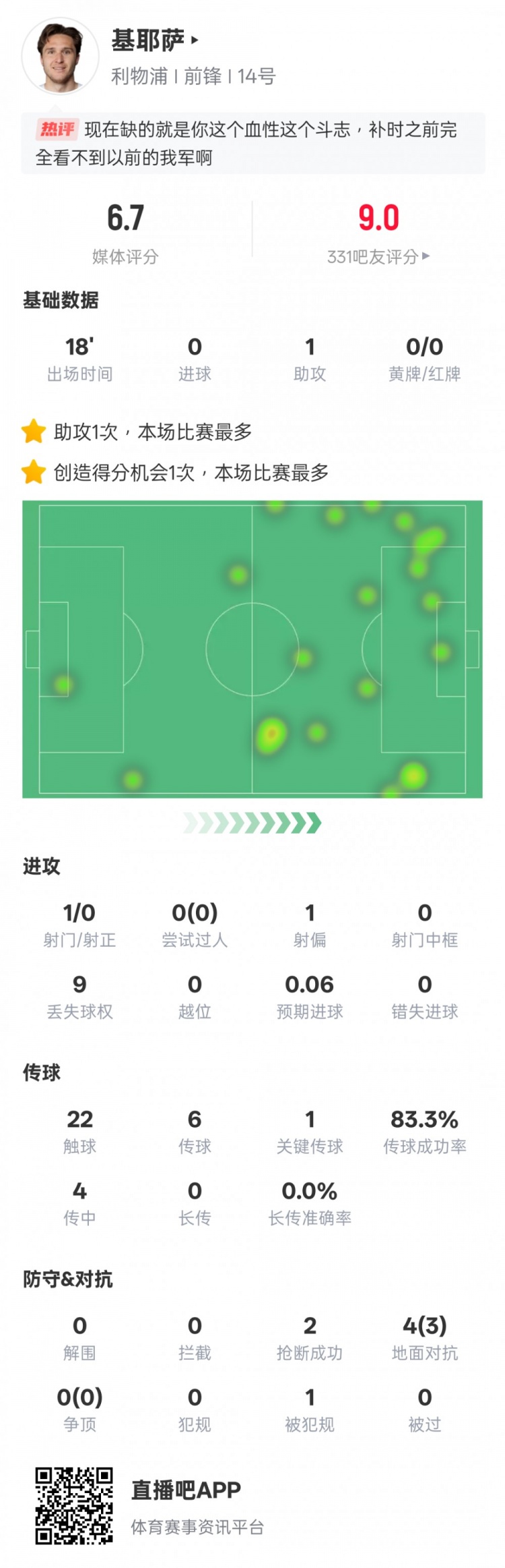 小基耶萨本场数据:替补出战1助攻1要津传球2抢断,评分6.7