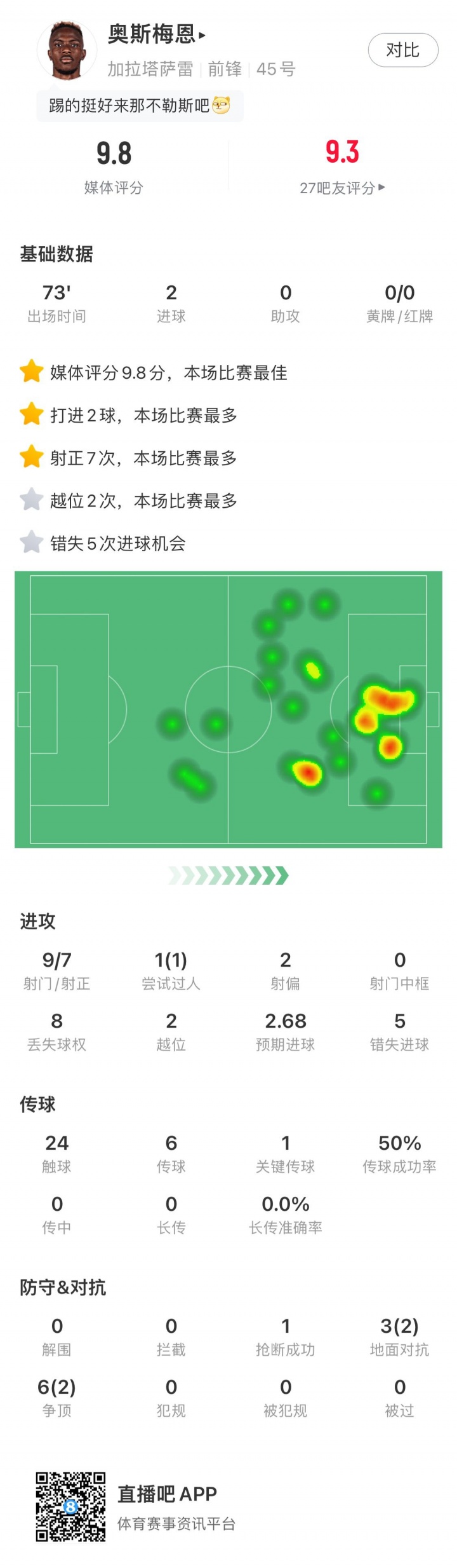 此役奥斯梅恩尽管梅开二度,但他9次射门7次射正,单场5次错失进球。