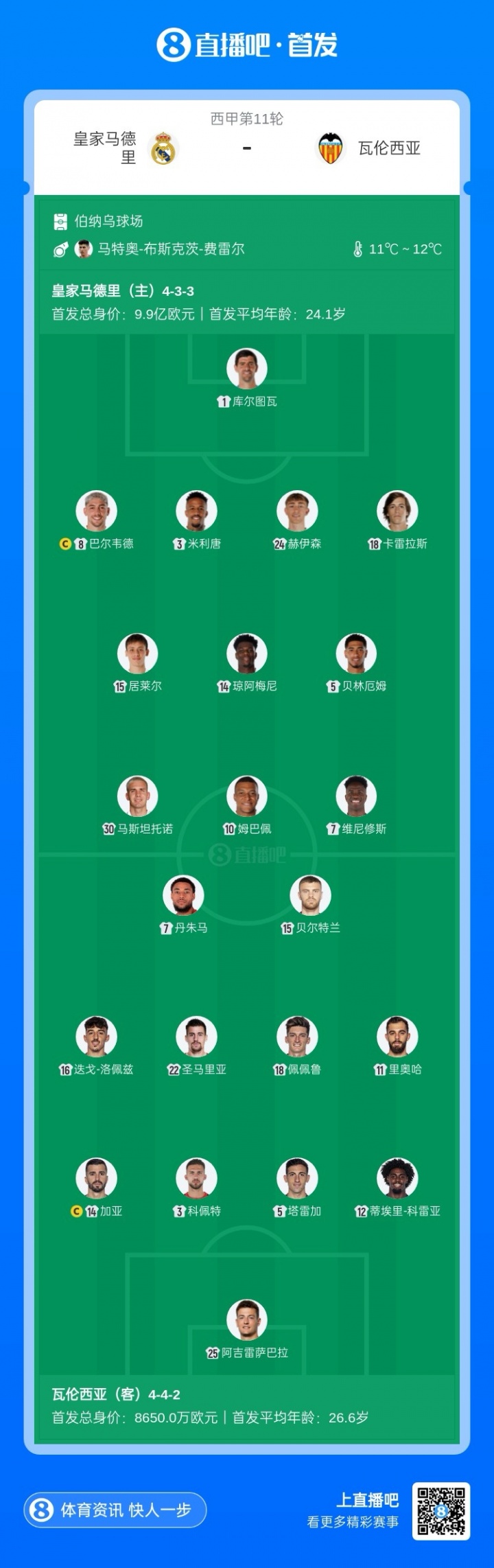 皇家马德里首发:1-库尔图瓦、8-巴尔韦德、3-米利唐、24-赫伊森、18-卡雷拉斯、14-琼阿梅尼、5-贝林厄姆、15-居莱尔、30-马斯坦托诺、7-维尼修斯、10-姆巴佩