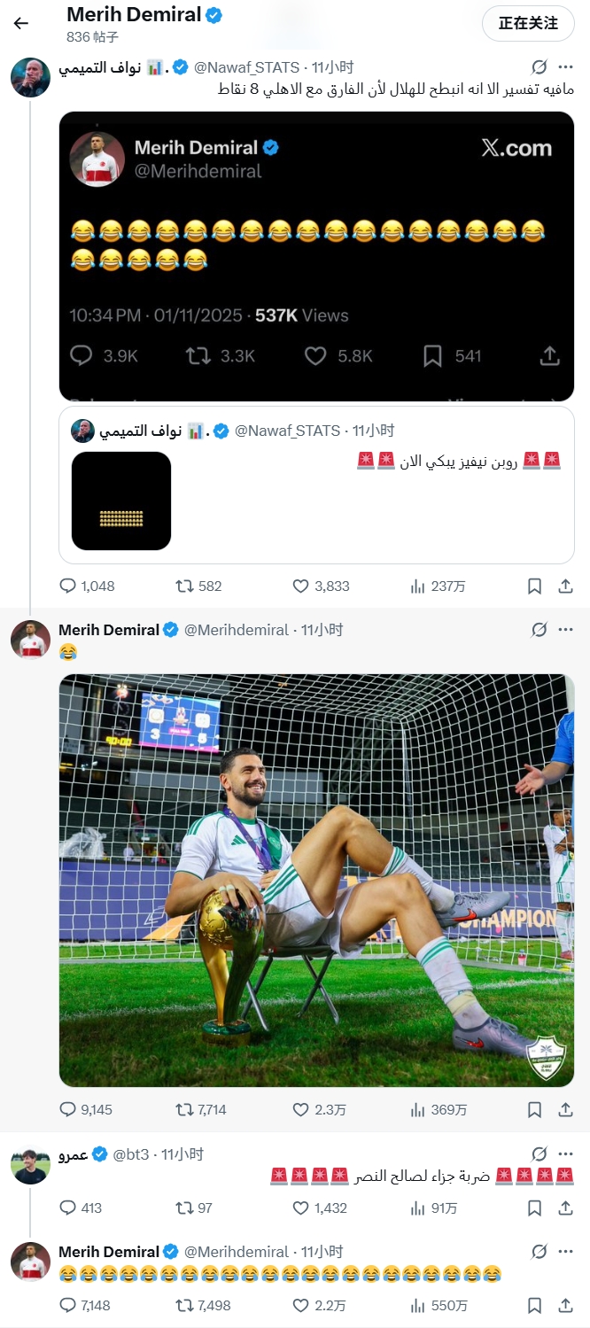 在目睹VAR终末时辰判给利雅得得胜点球后,包括效率于利雅得月牙的鲁本-内维斯、马尔科姆,以及效率于吉达国民的马赫雷斯、德米拉尔均在酬酢媒体发出了一连串的笑哭神采。